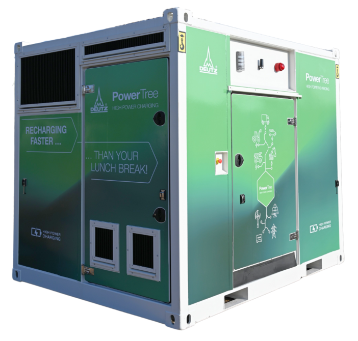 Der PowerTree von DEUTZ ist die erste steckerfertige, flexible Schnellladestation. Er ist ein mobiles und robustes System, um Maschinen schnell und sicher aufzuladen.