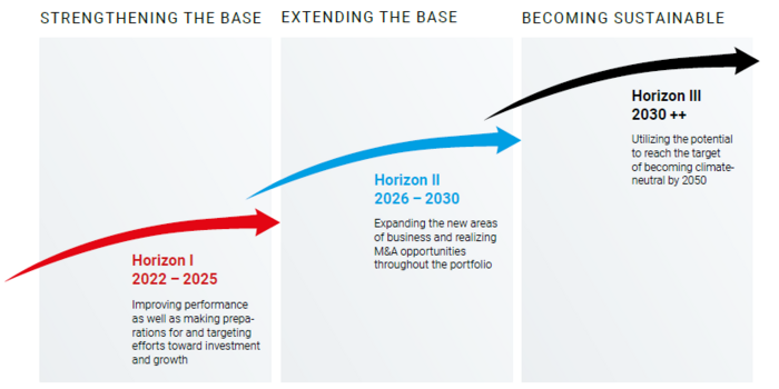 Wir verfolgen klare strategische Kriterien für unseren Weg in die Zukunft: Mit dem Eintritt in den „zweiten Horizont“ werden wir die „Dual+“-Strategie neu ausrichten. Die aktualisierte Strategie wird vom Transformationsprogramm „Powering Progress“ begleitet. Es fokussiert sich auf die zwei Aspekte Struktur und Strategie. Das Programm bündelt insgesamt elf Initiativen, die jeweils Prozesse definieren, realisieren und auch messen, wie und ob die definierten Ziele erreicht werden.