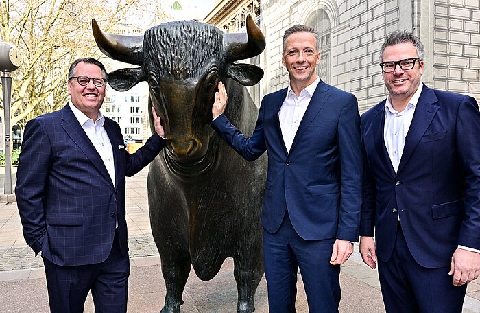 Dr Dietmar Voggenreiter, Dr. Sebastian C. Schulte and Oliver Neu in front of Frankfurt Stock Exchange.