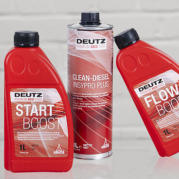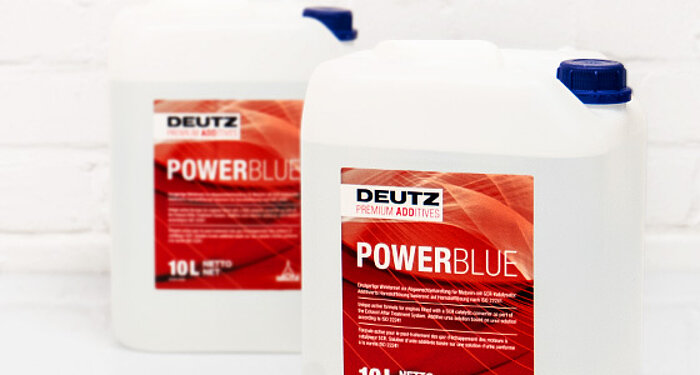 DEUTZ PowerBlue is an optimized alternative to the standard AdBlue® / AUS / DEF urea solution. DEUTZ PowerBlue is based on a urea solution according to ISO 22241 resp. DIN 70070 and improves the spraying behaviour of the urea solution into the exhaust gas stream through use of a special additive.